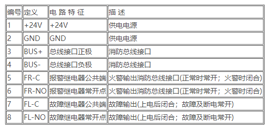 四.Flax51點型紫外火焰探測器接線方式所有信号線和電源線宜採用截面積大於1.0mm的導線,並嚴格按規範要求進行布線,其中探測器外殼應良好接地。探測器接線定義見下表: