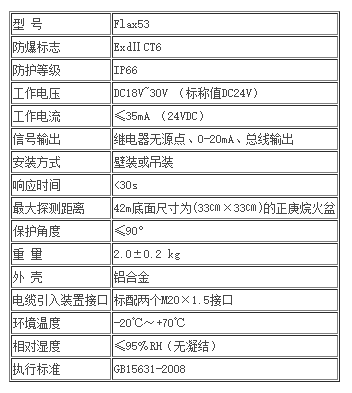 點型紅外火焰探測器(以下簡稱探測器)屬於(yú)防爆智能型火災探測設備,它運用瞭(le)先進的多紅外傳感技(MIR),使用具有窄帶濾波的不同波長的紅外傳感器,其中一隻傳感器工作在反映火焰信息的中心波長,另外兩隻傳感器監視環境中的其他紅外輻射,結合火焰的閃爍特征,通過高性能的微處理器和先進的數學算法模型進行運算分析,使得隻有符合火焰特征的輻射頻譜才會被確認爲火警,而其他的幹擾因素形成的假火警信号則會被排除。本探測器能夠對日光、閃電、電焊、人工光源、環境(人等)、熱輻射、電磁幹擾、機械振動等幹擾有很好的抑制,從而實現瞭(le)對火焰信号的快速響應和準確識别。本探測器採用非接觸式探測,靈敏度現場可調,提供無源接點、标準電流輸出和總線接口與火災報警系統相連接。本探測器适用於(yú)無煙液體和氣體火災、産生煙的明火以及産生爆燃的場所。例如:航天工業、飛機庫、飛機修理場、化學工業、公路隧道、彈藥和爆炸品倉庫、油漆工廠、石油化工企業、制藥企業、發電站、印刷企業、易燃材料倉庫等可燃物含碳物質的其他場合。本探測器根據GB3836.1-2010《爆炸性氣體環境用電氣設備第1部分:通用要求》、GB3836.2-2010《爆炸性氣體環境用電氣設備第2部分:隔爆型“d”》的規定,制成隔爆型結構,其防爆标志:ExdⅡCT6。适用於(yú)工廠具有ⅡA、ⅡB、ⅡC級,引燃溫度組别爲T1~T6組的1區、2區可燃性氣體或蒸氣與空氣形成的爆炸性混合物的場所。