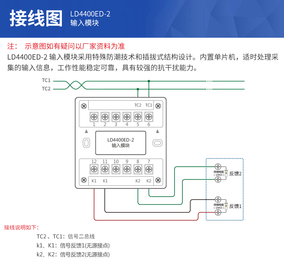 1、二總線,無極性。 2、LD4400ED-2輸入模塊採用電子編碼,占一個節點地址(0~255)。 3、單色指示燈顯示動作信息。 4、可接收兩路無源開關接點信号。 5、LD4400ED-2輸入模塊可檢測無源開關接點線路斷線故障。 6、替代利達的LD4400EN-2,功能相同,抗幹擾性增強。