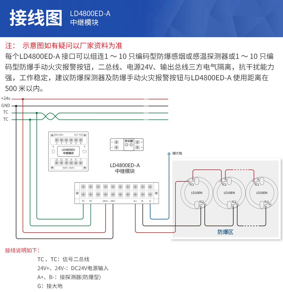 2、二總線、電源24V、輸出總線三方電氣隔離,抗幹擾能力強,工作穩定。 3、建議防爆探測器及防爆手動火災報警按鈕與LD4800ED-A使用距離在500米以内。