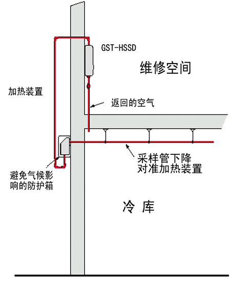 冷庫中採(cǎi)樣管,加熱箱和吸氣式感煙火災探測(cè)器的相對位置
