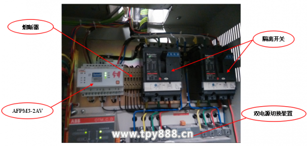 本商場綜合樓項目的AFPM3-2AV三相交流雙電源電壓傳感器安裝於(yú)斷路器或隔離開關的輸出端和雙電源切換裝置的輸入端之間,主電源電壓信号接1,2,3,4這四個端子,備(bèi)用電源電壓信号接5,6,7,8這四個端子,以位於(yú)地下室區域的消火栓泵配電箱雙電壓監控爲例,傳感器AFPM3-2AV安裝位置示意圖如圖2所示,實物安裝位置圖如圖3所示,電壓信号接線示意圖如圖4所示。