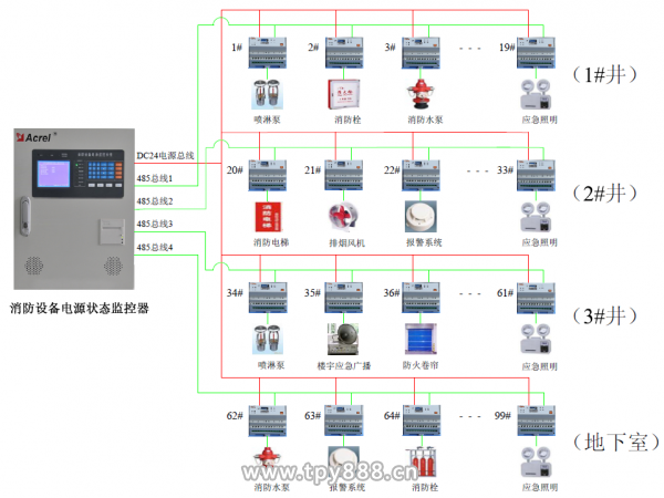 本商場綜合樓項目的傳感器主要安裝在1#井、2#井、3#井和地下室這四個區域,由於(yú)消防設備的供電電源是一路主電源和一路備用電源,因此傳感器選用AFPM3-2AV,其中1#井分布19個AFPM3-2AV,2#井分布14個AFPM3-2AV,3#井分布28個AFPM3-2AV,地下室分布38個AFPM3-2AV,總計99個。結合傳感器數量及其實際分布情況,消防設備電源監控系統採用小型組網方式即可,即消防設備電源狀态監控器+電壓傳感器的兩層結構組網模式如圖1所示,從而簡化瞭(le)系統結構設計。整個監控系統功能全面,安全可靠,探測準確,性價比高,系統内部採用RS485網絡通信,對外提供Modbus-RTU通信協議,以滿足其它标準系統的連接。