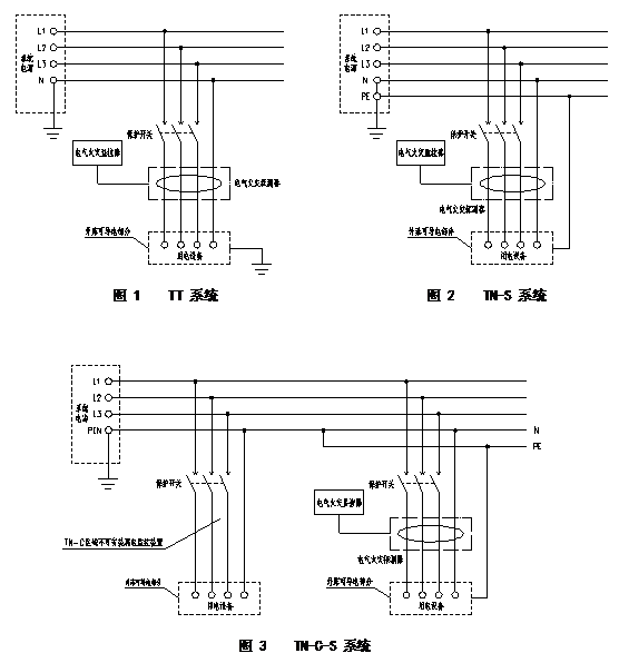 3.4.4TN-C-S接地系統中,電氣火災監控系統的剩餘電流動作保護隻允許使用在PE線與N線分開以後的部分。