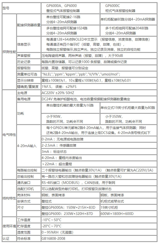 該産品爲引進PLC技術生産的更新換代産品,爲模塊化氣體探測控制系統,由多種不同功能的單元模塊構成,有GP6DU1有集控功能的二路4-20mA通道模塊、GP6DU2二路4-20mA通道模塊、GP6CU控制模塊。GP6000系統的簡單化設計和配置方式,保證設計院、-終用戶及工程服務商方便的進行系統設計、配置及調試運行。該系統完全符合--消防标準要求,同時取得瞭(le)消防産品型式認可證書。GP6000系統全方位支持多種探測器,包括可燃氣體探測器、有毒氣體探測器、火焰探測器、溫度探測器及一些狀态開關。無論是三線4-20mA儀表還是二線4-20mA儀表、支持HART協議儀表等都可接入GP6000系統。GP6000氣體探測報(bào)警系統滿足與上一級DCS系統、第三方SCADA系統通訊的不同通訊接口要求。爲實現外部通訊鏈接,GP6000系統提供支持ModbusRTU協議的标準RS-485串行通訊接口。