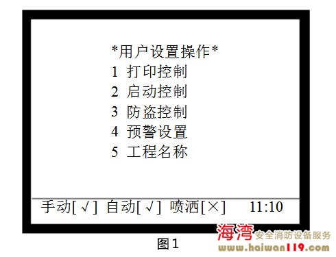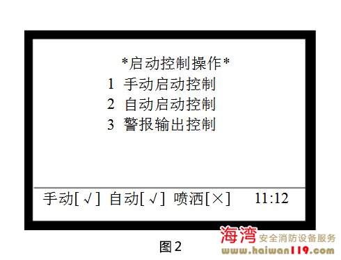 啓動控制設置 在圖1所示界面下,按2進入“啓動控制”界面,調出啓動控制操作菜單(dān),如圖2所示,包含手動啓動控制、自動啓動控制、警報(bào)輸出控制的設置,可通過按下其對應的數字鍵進行相關的設置