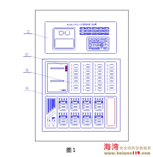JB-QB-GST200火災報警控制器(聯動型)面闆由顯示操作區、總線制控制區、多線制控制區及打印機面闆組成,其結構示意圖如圖1所示: