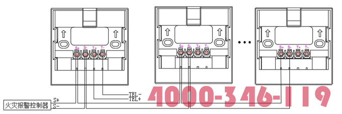 “S+”、“S-”爲總線端子,接入火災報(bào)警控制器;“T+”、“T-”爲對講電(diàn)話接線端子,可根據需要接入消防電(diàn)話主機。