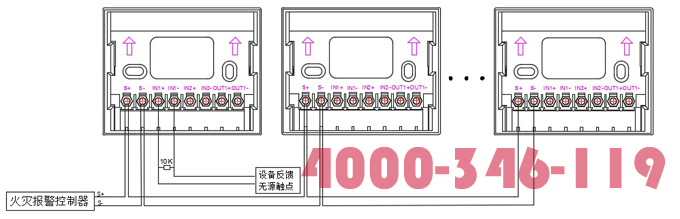 “S+”、”S-”爲總線端子,接入火災報(bào)警控制器;“IN1+”、“IN1-”接現場設備無源觸點的常開或常閉開關量信号,同時在被控設備的常開觸點上直接並(bìng)接一個10K終端電阻。