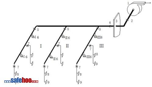 某商業建築,建築總高度26m,總建築面職137519㎡。其地下一層爲地下汽車庫、人防、設備用房和建築面積爲10000㎡的地下商業。地下汽車庫停車數499輛,建築層高3.70m,淨高2.30m,主梁高0.90m, 車庫防火分區面積均小於(yú)4000㎡,防煙分區面積不大於(yú)2000㎡,機械排煙系統按防火分區設置,並(bìng)按排風與排煙兼容的模式工作,且排風口與排煙口分開設置,系統排煙量按6次/h換氣次數計算,其中-大的一個機械排煙系統爲PY(F)-B1-3系統,爲防煙分區Ⅰ (面積1426㎡),防煙分區Ⅱ (面積1726㎡) 和防煙分區 Ⅲ(面積2000㎡) 服務,其排煙風機的排煙量爲53280m3/h,系統構成見圖2-31-1。